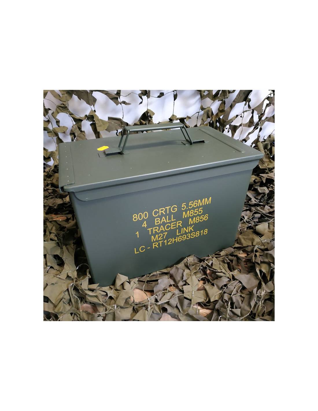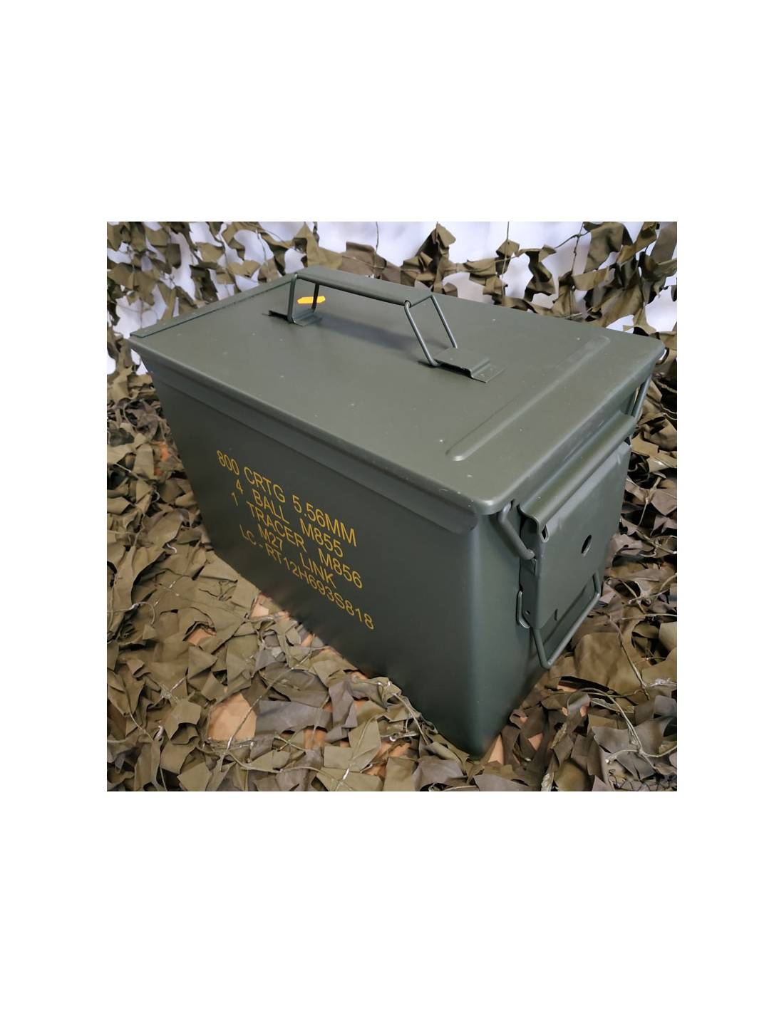 Khaki metal case with yellow or white lettering depending on arrival, markings may differ from photo and some markings have been removed.