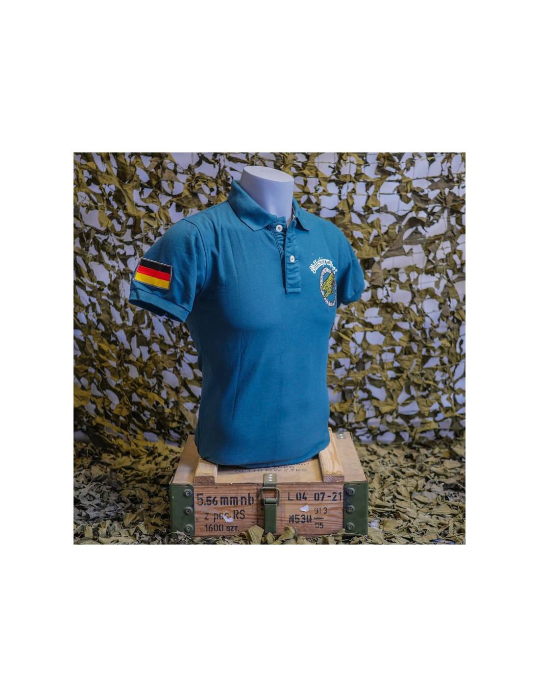 Short sleeve military polo shirt. Cotton and polyester military garment. Comfortable and resistant paratrooper polo shirt. Blue polo shirt embroidered with Fallschirmjäger insignia. High quality embroidery and finishing.