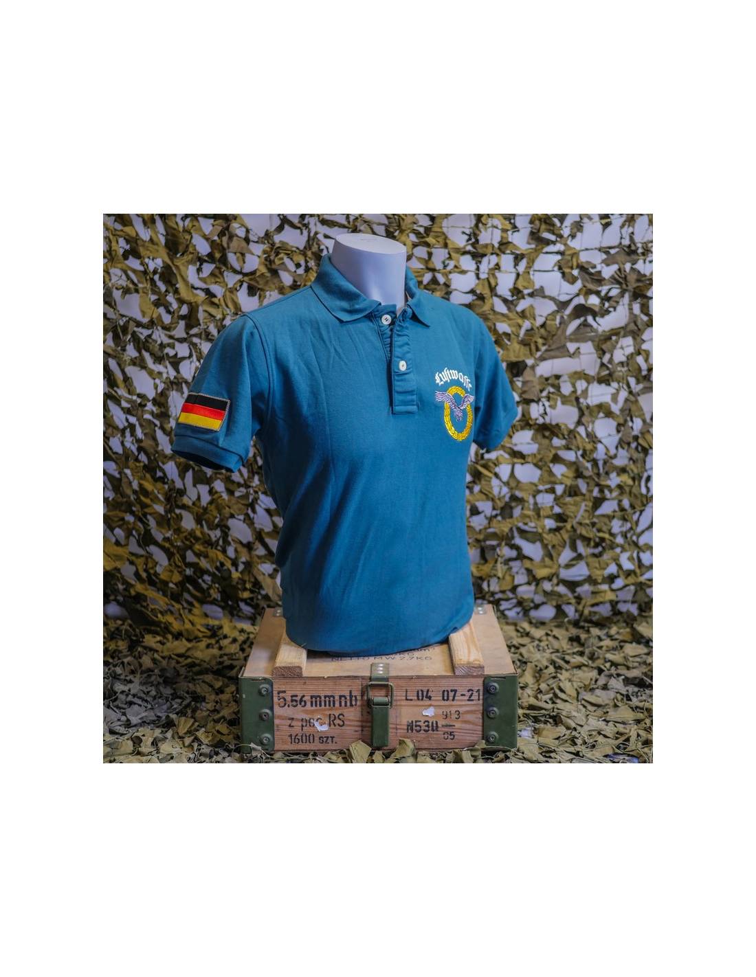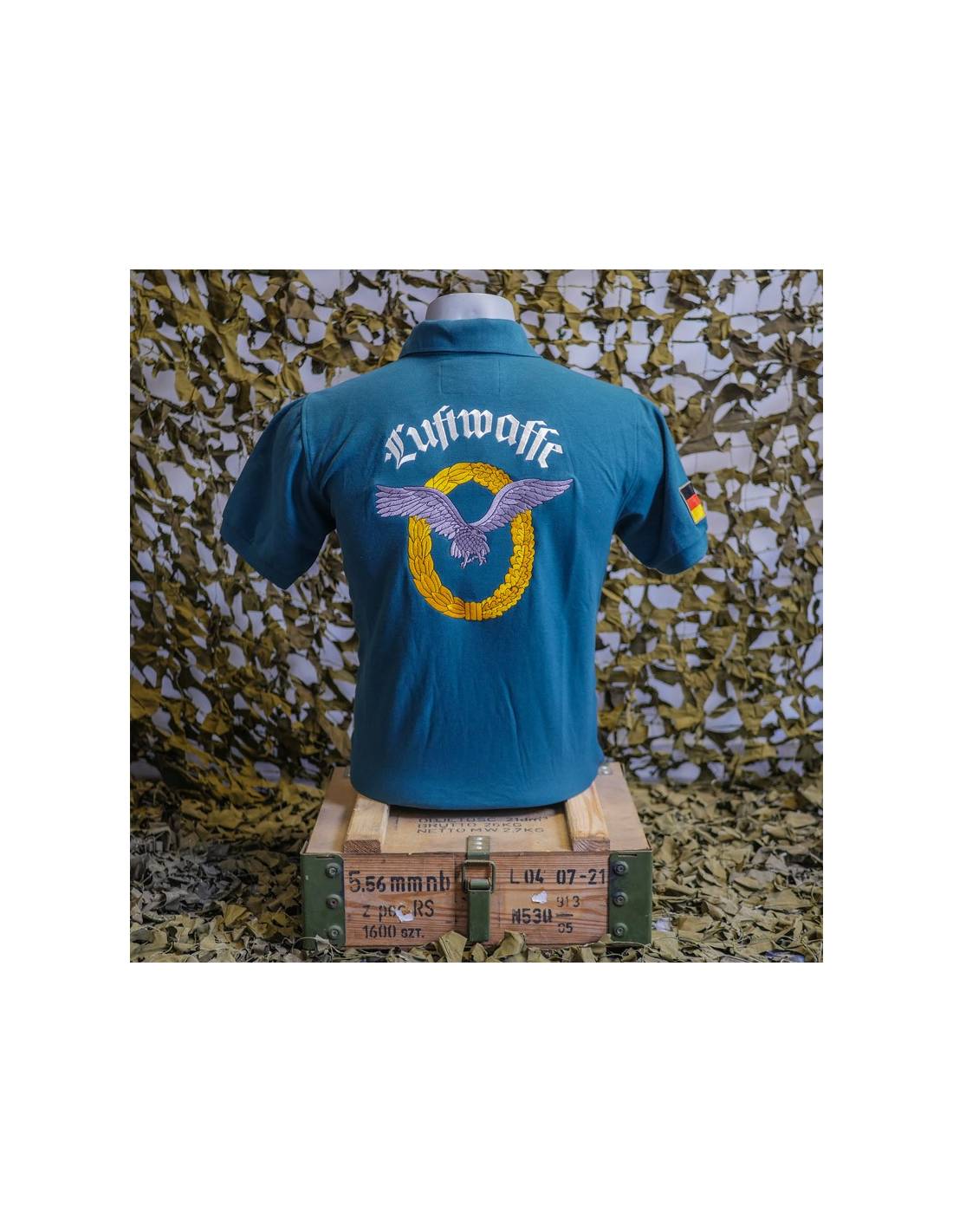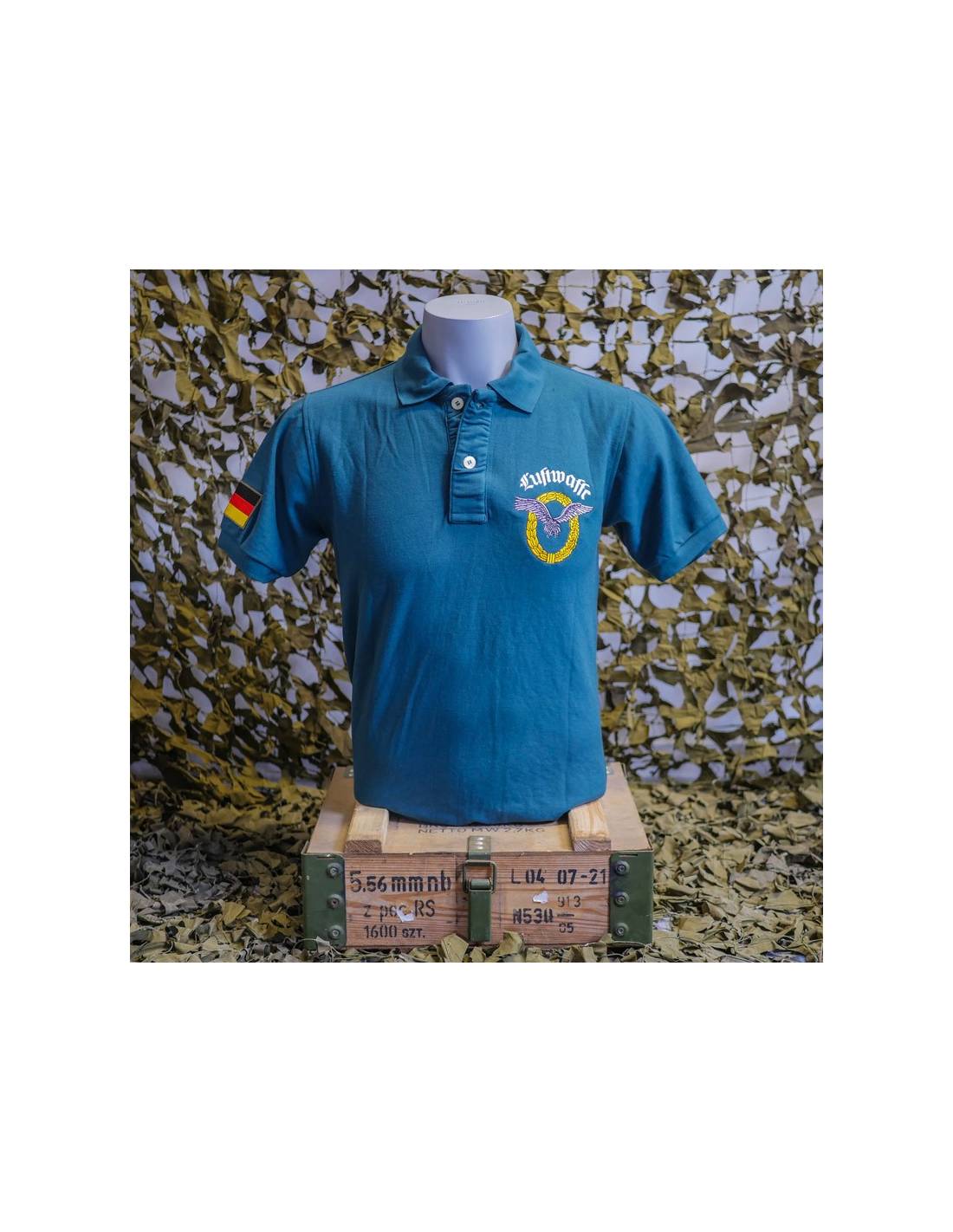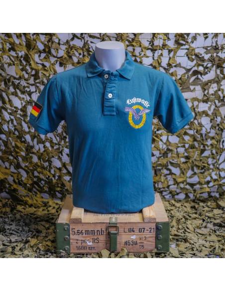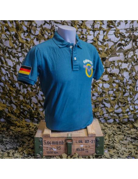 The paratrooper polo shirt is a quality military garment, comfortable and personalized. It is a short sleeved military dress top with a two-button neckline. It is made of 70% cotton and 30% polyester, and has an anti-perspiration comfort band at the neckline. This blue military polo shirt is embroidered with the Luftwaffe crest on the chest and back and the German flag on the sleeve. The Luftwaffe insignia represents a silver eagle with outstretched wings, surrounded by a gold crown of laurel and oak leaves.