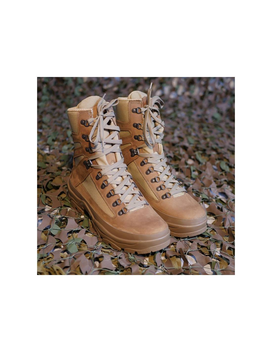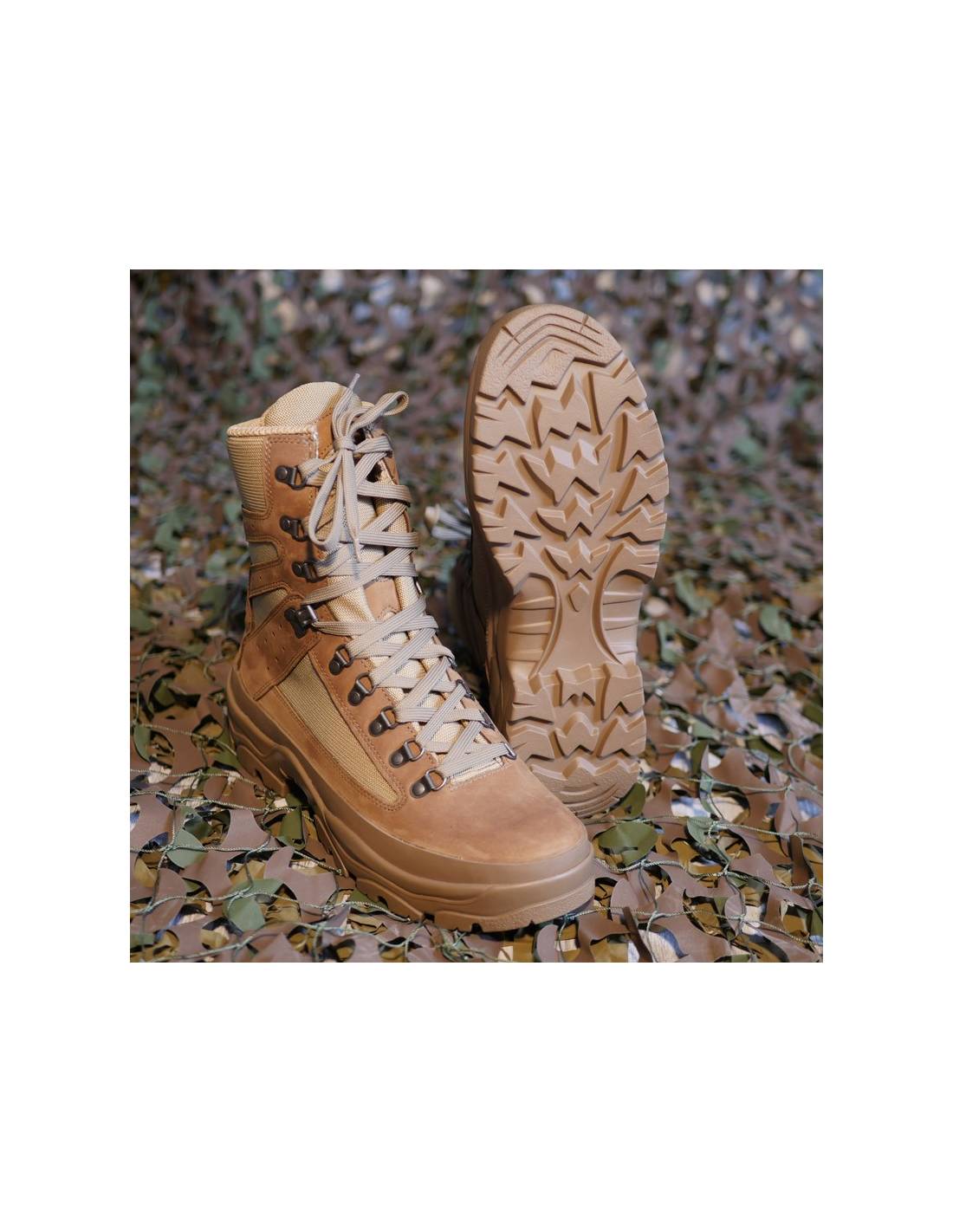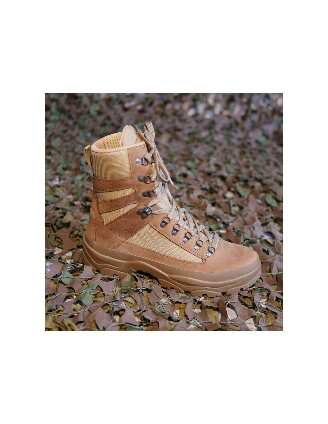 Spécialement conçues pour répondre aux exigences liées aux combats en milieu désertique, ces chaussures d'intervention sont respirantes, confortables et très solides. Notamment utilisées lors d'interventions en Centrafrique, ces rangers commando sont particulièrement appréciées par nos militaires confrontés aux zones arides et rocailleuses de la planète. Ces brodequins de marche répondent aux exigences de professionnalisme de l'armée française. Cet équipement conviendra donc parfaitement au public souhaitant arpenter des terrains accidentés en zone chaude. Alliant résistance, confort et maintien, cette chaussure commando sera parfaite pour les randonnées, les treks ou autres activités extérieurs sous de fortes températures. Elle possède une semelle intérieure confortable avec amortie au niveau du talon. Le cuir et le nylon utilisés sont d'excellente qualité. Le laçage est rapide grâce aux crochets et œillets métalliques, qui sont également traités pour résister à la corrosion pour plus de solidité. La forme de la chaussure offre un solide maintien de la cheville et du pied. Et enfin, la semelle en caoutchouc crantée permet une stabilité et une aisance de marche agréable.